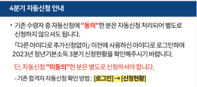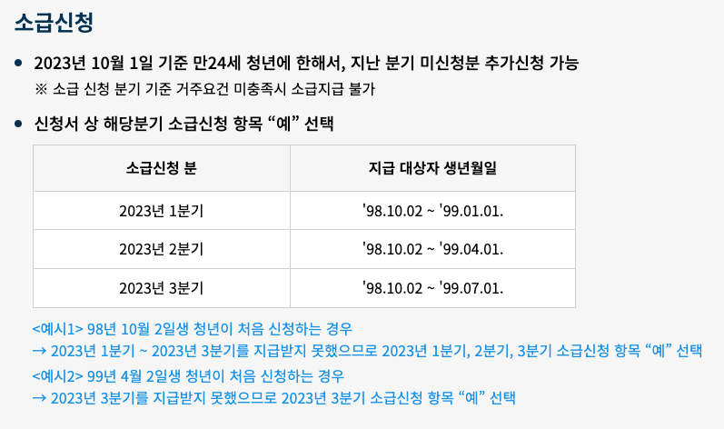 4분기에 처음 신청하시는 거라면 지난 분기 지원금도 소급 신청할 수 있습니다. 다만 해당 시기에 연령 및 거주 조건을 충족해야 소급 지급 받을 수 있다는 점 기억하셔야 합니다.  23년 1분기 (98년 10월 2일 ~99년 1월 1일생) 23년 2분기(98년 10월 02 ~99년 4월 01일생) 23년 3분기 (98년 10월 2일 ~ 99년 7월 1일생)까지 생년월일에 따라 소급 신청할 수 있습니다.