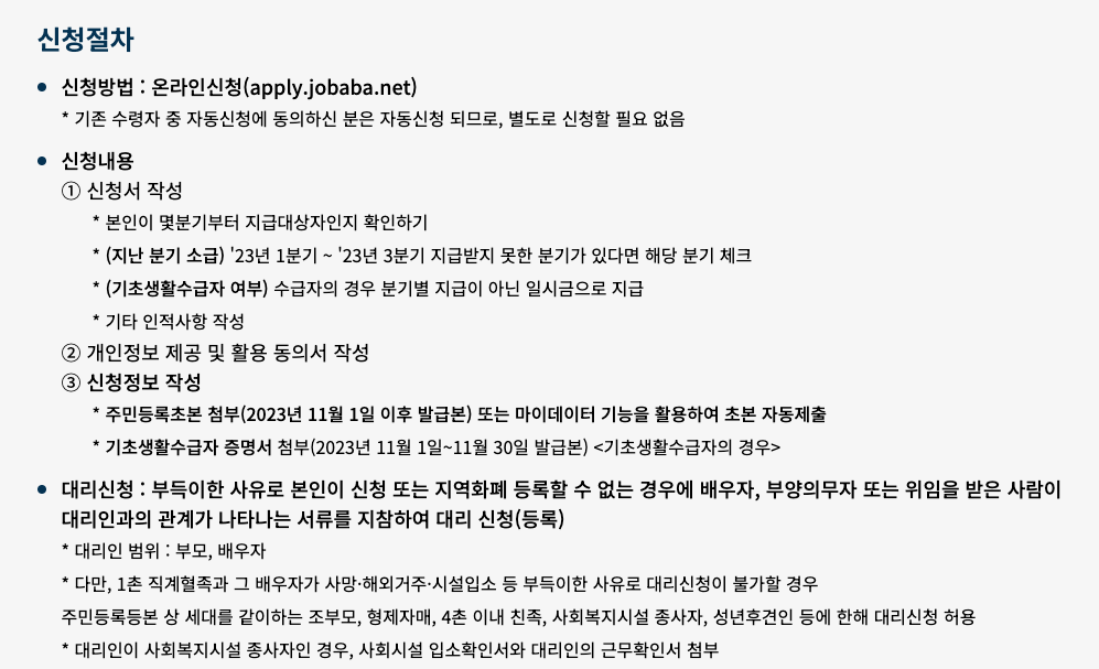 신청 기간은 23년 11월 1일(수)부터 23년 11월 30일(목) 18:00까지이니 자격이 되시는데 아직 신청하지 않으셨다면 이 기간 놓치지 말아야겠습니다. 지급 내용은 분기별 25만원을 최대 4분기까지 지원해주는데요. 각 시군의 지역화폐로 지급합니다.