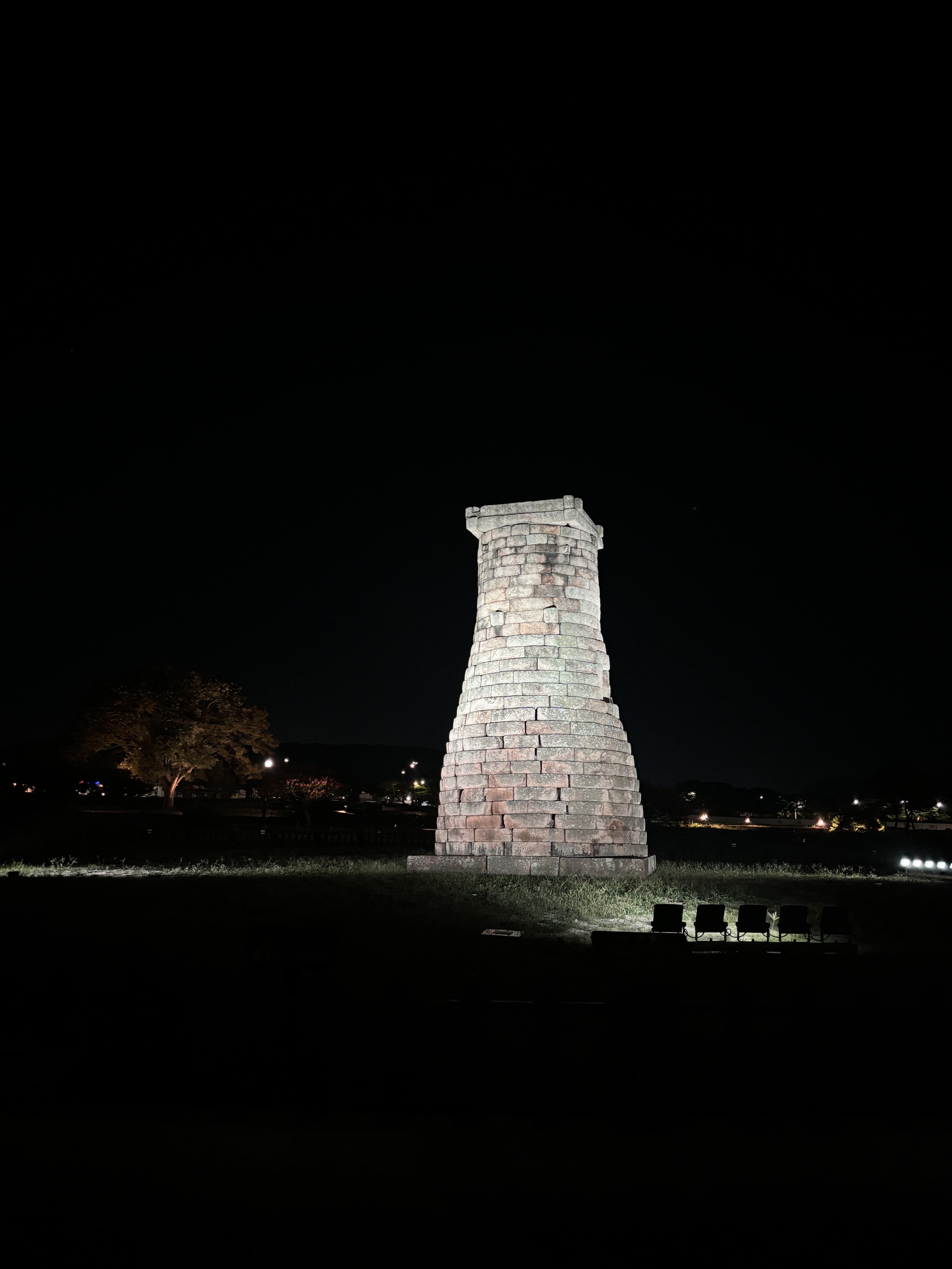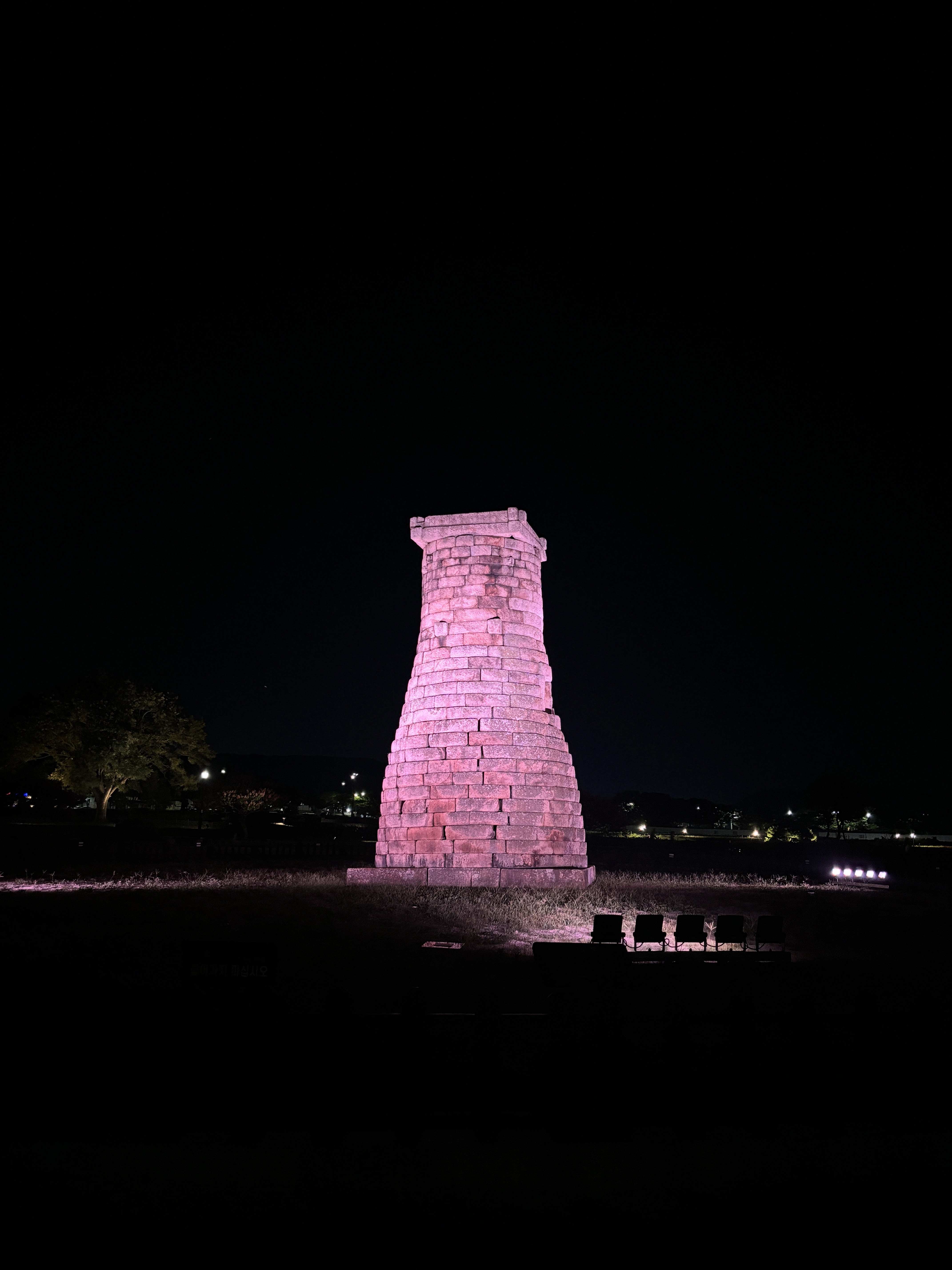 밤에는 첨성대를 색색의 조명이 번갈아 비춰줍니다. 조명에 따라 색이 바뀌는 첨성대의 모습은 아름답고 사진에 담기에 좋습니다. 첨성대 주변에 너른 벌판도 아이들과 걷고 뛰기에 좋은 산책 코스입니다.