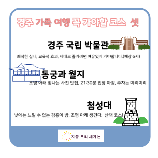 경주 가족 여행 준비 중이신가요? 경주 가족 여행 어디를 어떤 순서로 가봐야할 지 고민하시는 분들께 하루 반나절 일정 추천해드리겠습니다. 경주 가족 여행 꼭 가야할 코스 셋, 간단히 읽어 보시고 여행 계획 세우시는데 도움되시길 바랍니다.