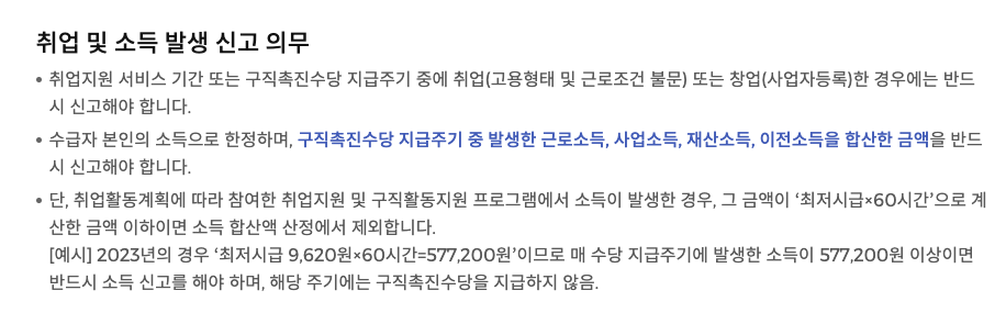 만약 구직촉진수당을 받는 중에 취업 등으로 수당이 발생한다면 반드시 신고해야 합니다. 수급자 본인 소득으로 한정하며 근로소득, 사업소득, 재산소득 등을 합산한 금액을 신고해야 합니다.