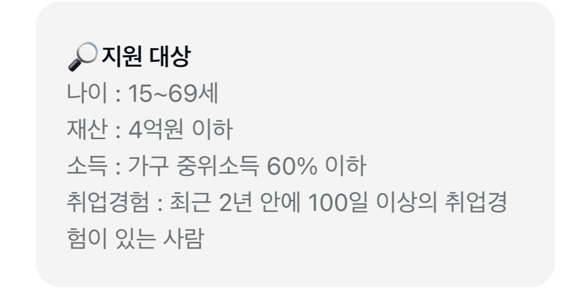 청년들의 경우 신청 조건의 보다 여유롭습니다. 만 18세 ~ 34세는 중위소득 120%, 재산 5억원 이하인 경우에도 신청가능하고 취업경험이 없어도 신청할 수 있습니다. 단 주 30시간 이상 일을 하거나 실업급여를 받고 있거나 대학교 재학생 혹은 군인이라면 지원 대상이 아닙니다.