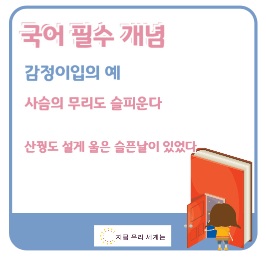 '감정이입'은 문학 개념어 중 학생들이 많이 헷갈려 하는 개념 중 하나입니다. 수능이나 모의고사에서 자주 등장하지 않지만 국어 내신에서는 자주 나오는 개념입니다.