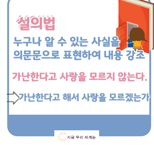 설의법은 의문의 형식을 갖추었지만 정말 궁금해서 물어 본 것이 아니라 답을 정해 놓은 문장이라고 볼 수 있습니다. 설의법은 문장 구조의 변화를 주어 의미를 강조하는 효과가 있습니다.