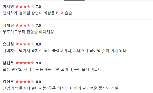 다음은 굿뉴스 평점입니다. 평점 7점~8점대로 높은 편입니다. 저는 개인적으로 올해 본 한국 영화 중 최고점을 주겠습니다.