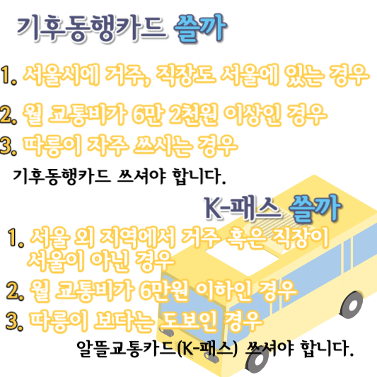 그러면 기후동행카드와 K-패스 중 어떤 걸로 교통비를 쓸지 결정하시기 전에 둘 중 어느 것이 혜택이 큰지 살펴보셔야겠습니다. 우선 기후동행카드는 월 교통비를 6만2천원 이상 지출하시면서 서울에 거주하고 서울 내 직장에 다니시는 분이 사용하셔야 합니다.