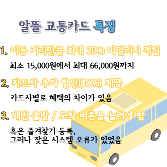 현재 시행 중인 알뜰교통카드는 이동거리만큼 사용한 교통비에서 일정 비율로 마일리지 적립해주는 방식이었습니다. 알뜰교통카드로 사용할 수 있는 카드를 별도 발급 받아 사용하고 카드사별로 제공하는 추가 할인 혜택도 받을 수 있습니다.
