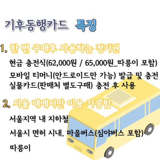 기후동행카드는 1월 27일부터 서울시에서 시범운영할 예정인 대중교통정기권입니다. 월 65,000(따릉이 포함, 따릉이 이용하지 않으면 62,000원) 충전하면 30일간 서울 대중교통을 무제한으로 이용할 수 있다는 것이 장점입니다.