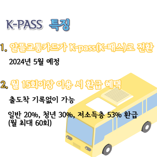 대중교통을 월 15회 이상 이용한 경우 그 이용금액에 대해 일반인은 20%, 청년 30%, 저소득증 53%환급해주는 제도입니다. (최대 60회까지) 현재 알뜰교통카드를 이용하고 계시다면 5월에 기존카드가 자동으로 K-패스로 전환된다고 하니 크게 신경쓰실 일은 없을 듯합니다.
