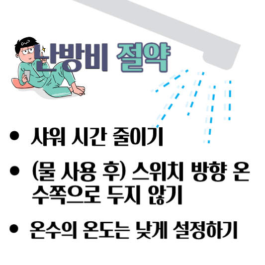 또 샤워나 세안 후 샤워기나 세면대스위치(밸브?) 방향을 온수 쪽으로 두시면 난방비가 샐 수 있습니다. 그러니 샤워나 세안 후에는 온수와 냉수를 조절하는 스위치(손잡이?)를 온수 방향으로 두지 않도록 해야합니다. 그래야 난방비를 절약할 수 있습니다.