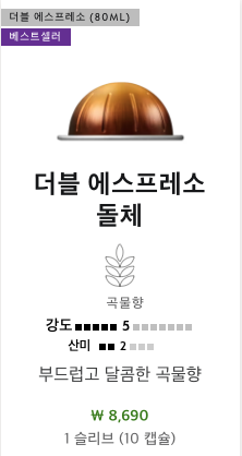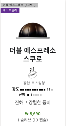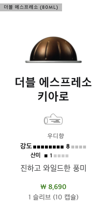 | 커피 강도 | 강도가 높을 수록 진하고 깊은 맛이 납니다.(숫자가 클수록 강도가 높음) |