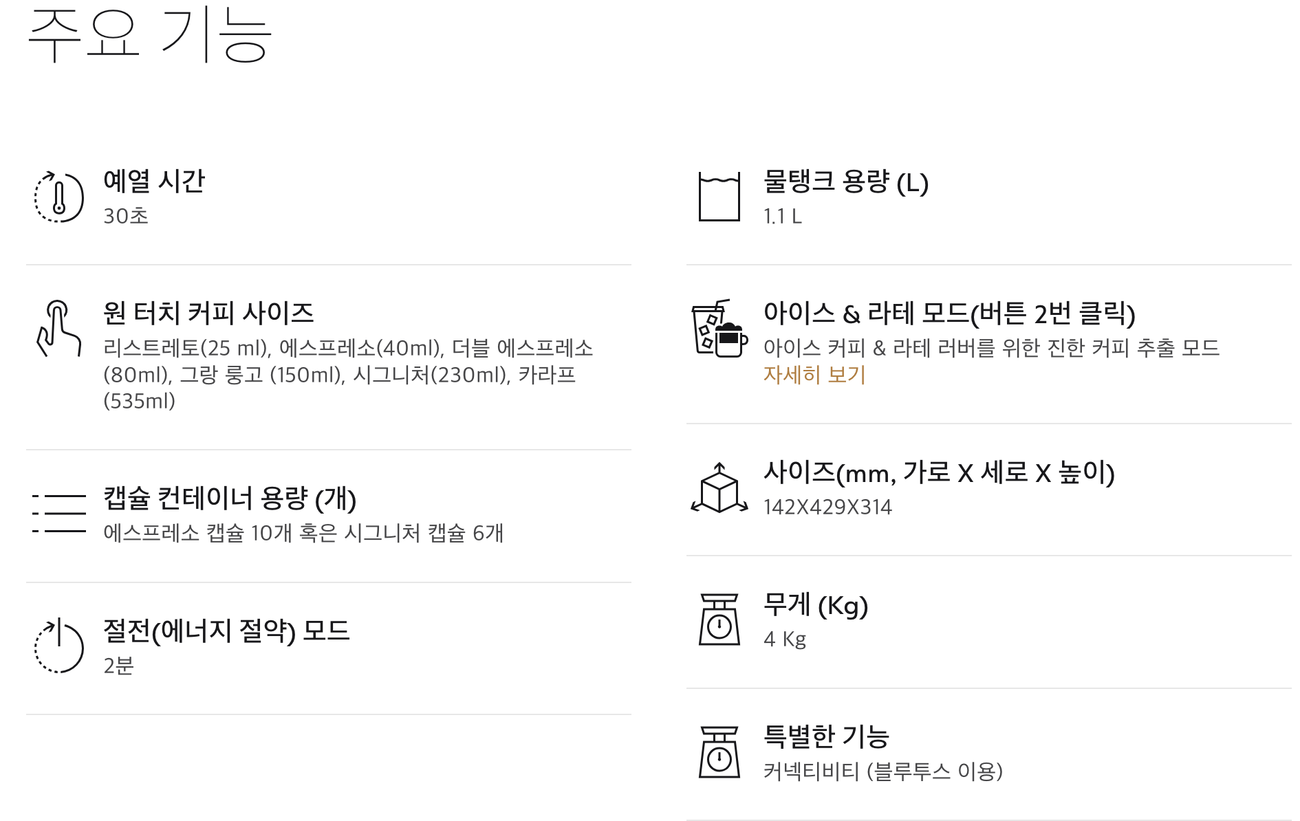 에스프레소부터 아메리카노, 핸드 드립 스타일의 커피까지 커피 스타일에 따른 최적의 크레마와 바디감의 커피를 즐길 수 있는 머신이라고 합니다.