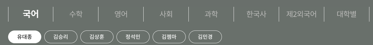국어는 대표 강사 유대종 선생님의 수업부터 김승리 쌤. 김상훈 쌤, 정석민, 김젬마, 김민경 쌤까지 주요 강사 분들의 수업 중 하나를 선택하여 수강하실 수 있습니다.