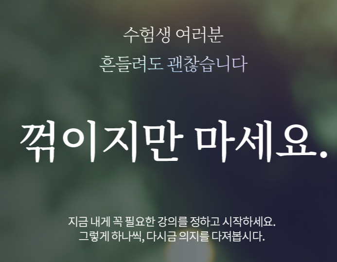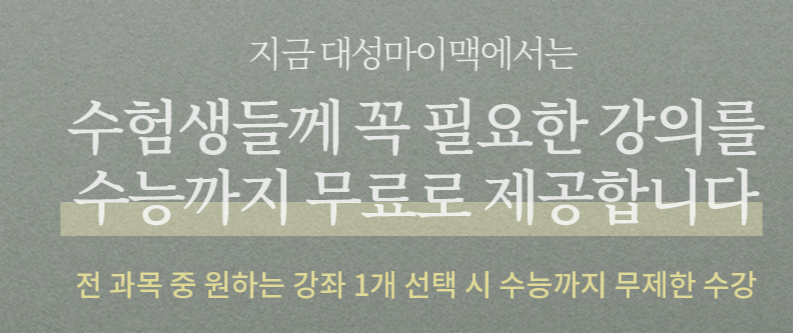 대성 마이맥에서는 수험생들께 꼭 필요한 강의를 수능까지 무료 제공한다는 이벤트를 진행중입니다. 수능이 얼마 남지 않은 요즘, 자칫 흔들리기 쉬운 시기인데 이런 이벤트를 통해 훌륭한 강의로 힘을 얻을 수 있다면 좋겠습니다.