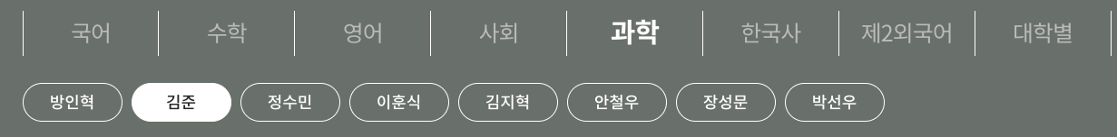 과탐은 화학 김준 쌤을 대표로, 방인혁, 정수민, 이훈식, 김지혁, 안철우, 장성문, 박선우 쌤의 수업이 있습니다. 사탐과 마찬가지로 본인이 선택한 영역의 수업을 고르시면 됩니다.