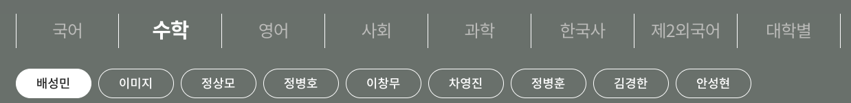 수학은 배성민 쌤부터 시작해서 이미지, 정상모, 정병호, 이창무, 차영진, 정병훈, 김경한, 안성현 쌤까지 선택의 폭이 가장 넓습니다. 자신의 진학 방향이나 선택 영역에 따라 필요한 수업을 하나 고르시면 도움이 될 듯합니다.