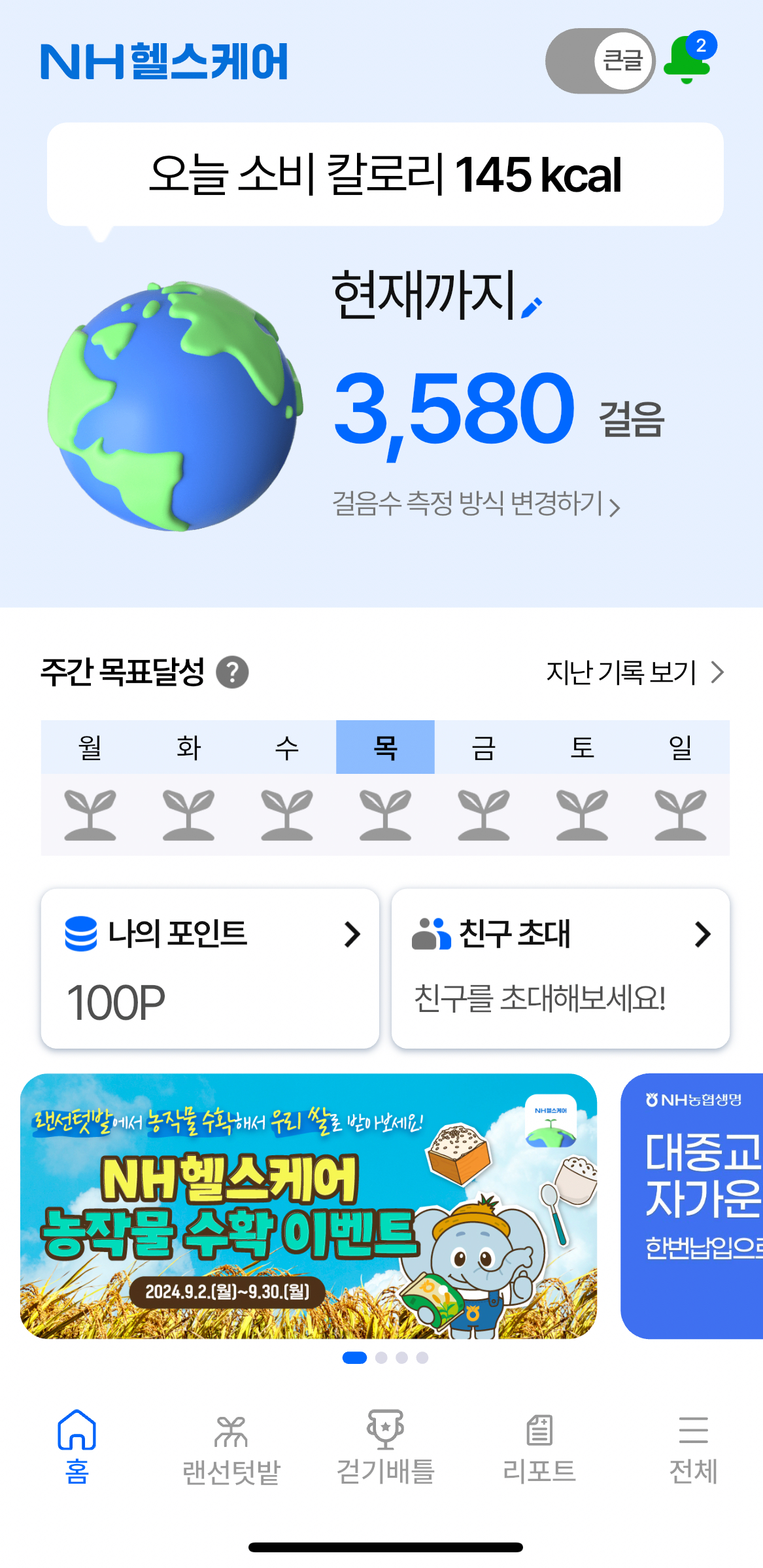 NH헬스케어는 신규 가입 100포인트, 목표 걸음 수를 스스로 설정하여 달성하면 매일 100포인트 랜선 농장물 키우기로 매일 500 포인트 적립할 수 있습니다. 열심히 적립하면 두 달에 한 번은 기프티콘 사용하실 수 있을 겁니다.