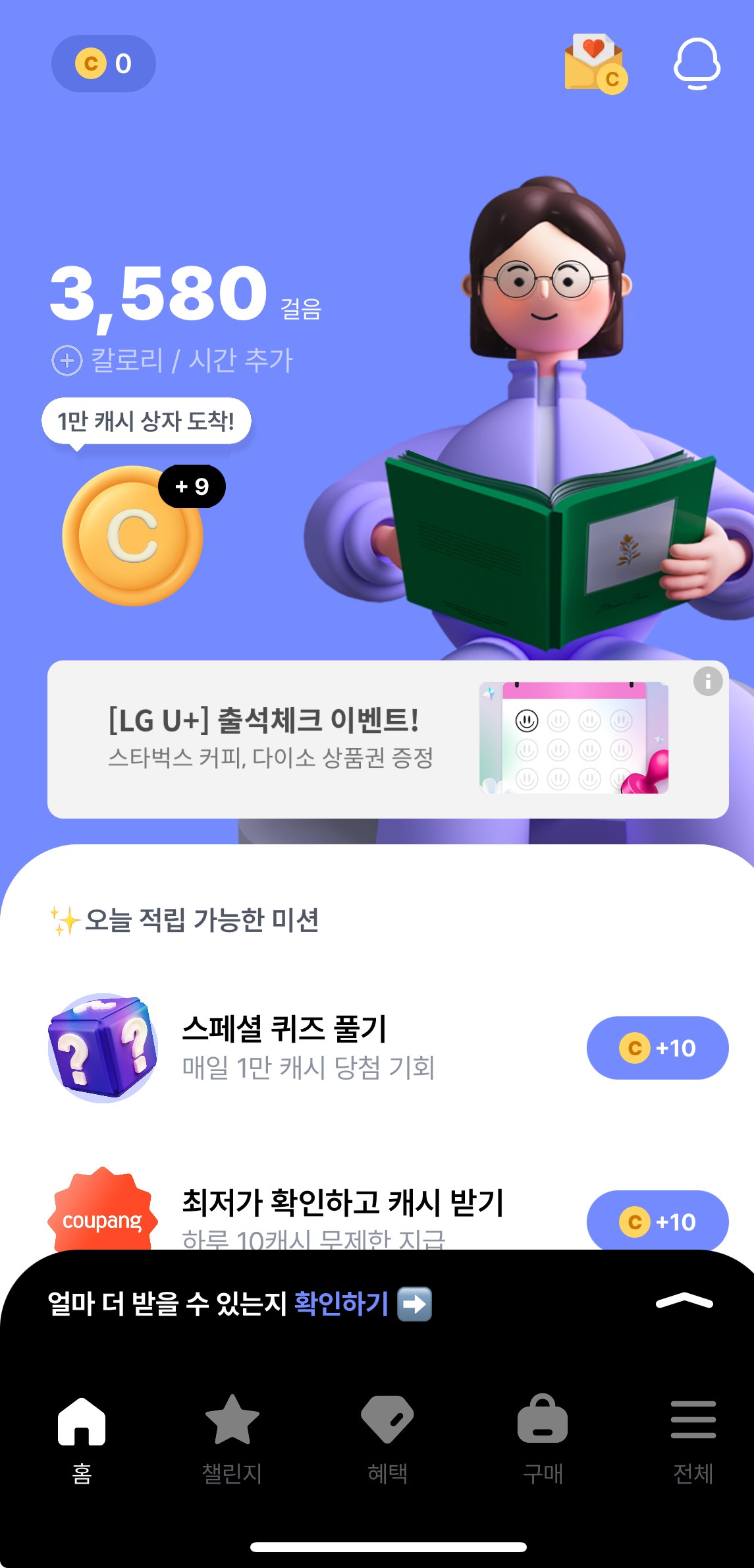 발로소득에서는 캐시 단위로 적립되는데요 걷기로는 하루 최대 30캐시, 챌린지 참여는 200~600캐시, 친구 초대 코드 입력이나 광고 보기 등으로 최대 1000 ~ 2000캐시 적립할 수 있습니다.