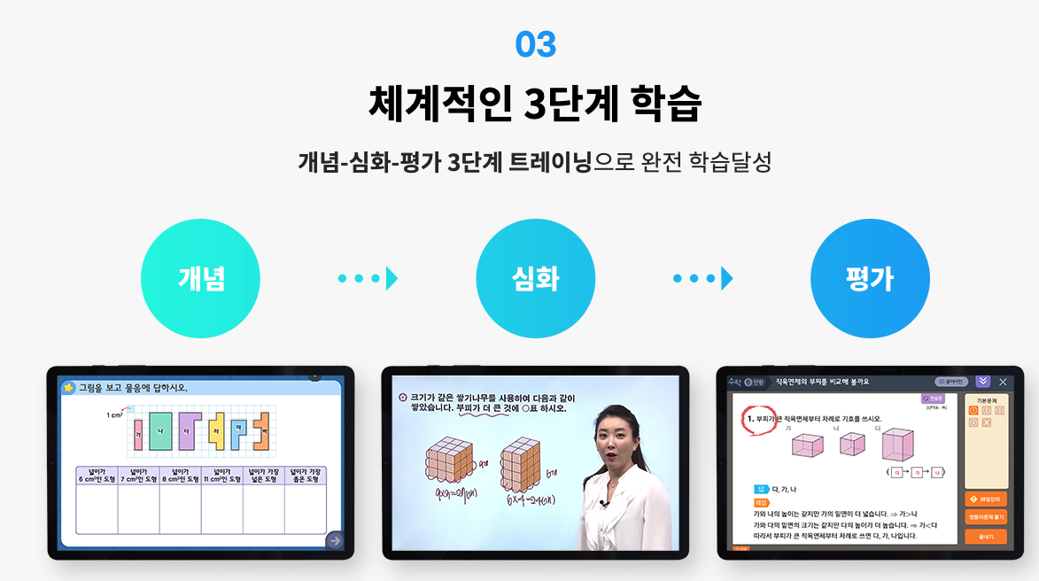 이후 과목별로 개념, 심화, 평가의 단계를 거쳐 체계적으로 학습할 수 있도록 합니다.