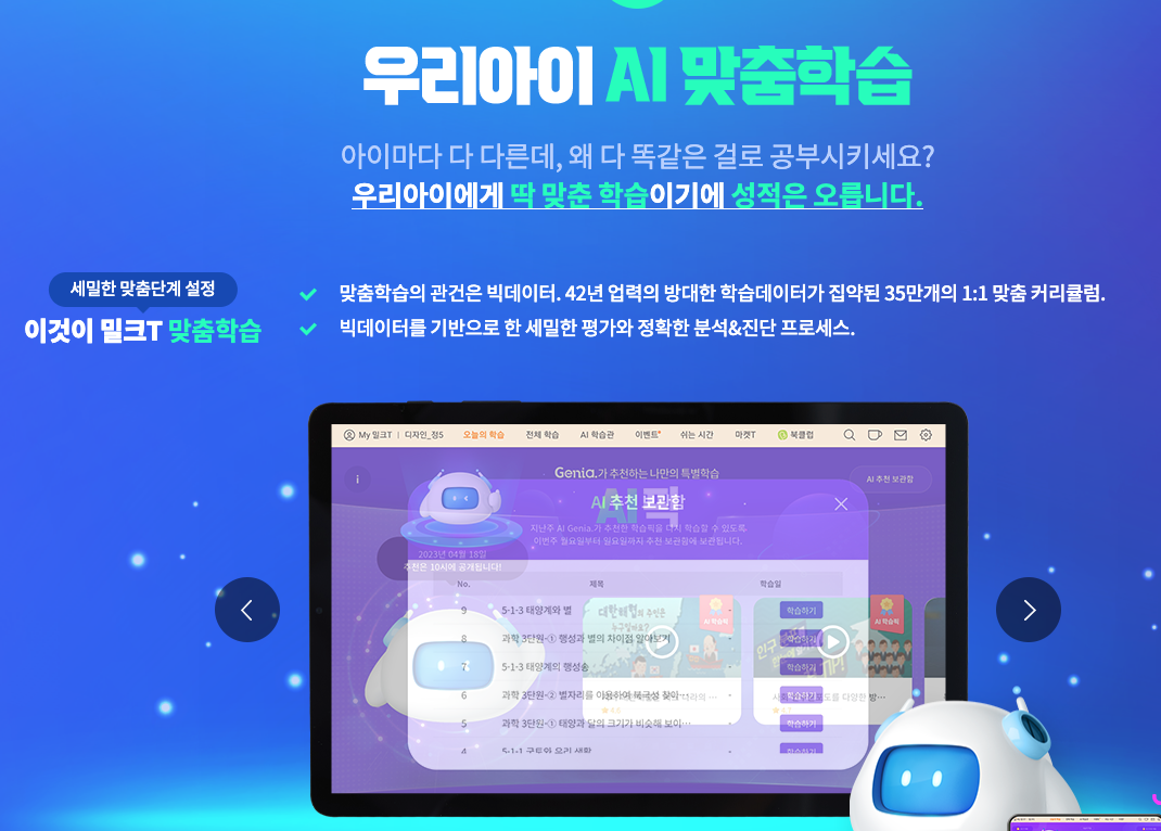 밀크T에서 가장 크게 내세우는 것 중에 하나는 자사가 '천재교육'이라는 점입니다.