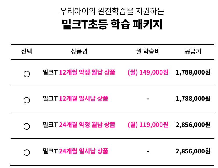 밀크T도 약정 개월에 따라 월납입 수강료에는 차이가 있습니다.