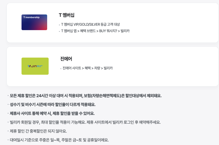 진에어 회원이신 경우에도 할인 혜택, 차량 빌리카를 선택하셔서 할인 받을 수 있습니다. 각각 제휴 사이트에서 예약하실 때 적용되고 빌리카 회원인 경우 최대 할인율 적용 가능하시니 제휴 사이트에서 빌리카 로그인 후 예약해주셔야 합니다.