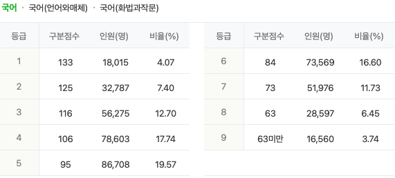 올해 국어 영역에서 1등급을 받은 학생들의 표준점수는 133점으로 2023학년도 수능 국어의 1등급 표준점수가 126점이었다는 것을 감안하면 올해 국어 영역이 더 어려웠음을 알 수 있습니다. 국어는 언어와 매체 그리고 화법과 작문 중 하나를 선택하여 시험을 보는데요 언어와 매체가 문법이 있어 공부하기 까다롭지만, 화법과 작문보다 표준점수가 높기 때문에 상위권 학생들은 보통 언어와 매체를 선택하는 경향이 있습니다.
