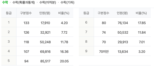 올해 수학 1등급 표준점수는 133점입니다. 이는 2023학년 수학 1등급 표준점수와 같습니다.