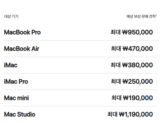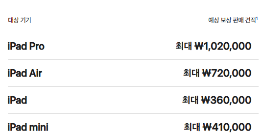 2026년 현재 기준 기기별 예상 보상액 (최대치 기준)이 정해져 있는데, (물론 기기 상태에 따라 보상 금액은 차이가 있습니다만) 현재 애플 스토어에 고시된 기기별 최대 보상 가격은 다음과 같습니다.
