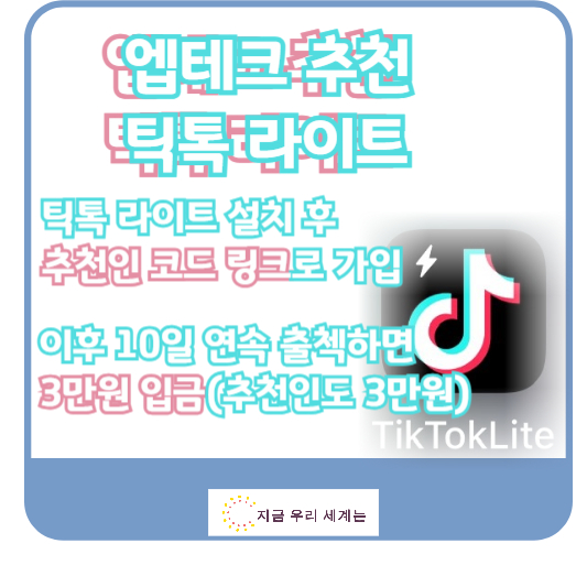 어플 '틱톡 라이트'로 앱테크 하시려면 당연히 어플 설치하셔야겠지요? 그런데 무작정 틱톡 라이트 설치 후 가입하시면 출첵 보상 못 받습니다. 틱톡 라이트 설치 후 가입하실 때에는 반드시 추천인 코드를 따라 가입하셔야 혜택 받을 수 있습니다. (추천인 코드 공유)