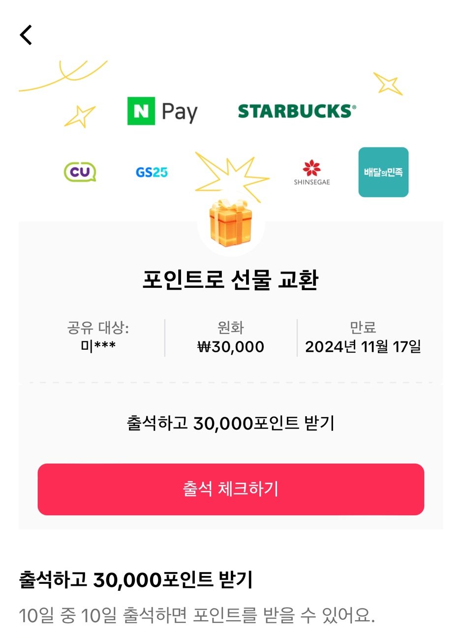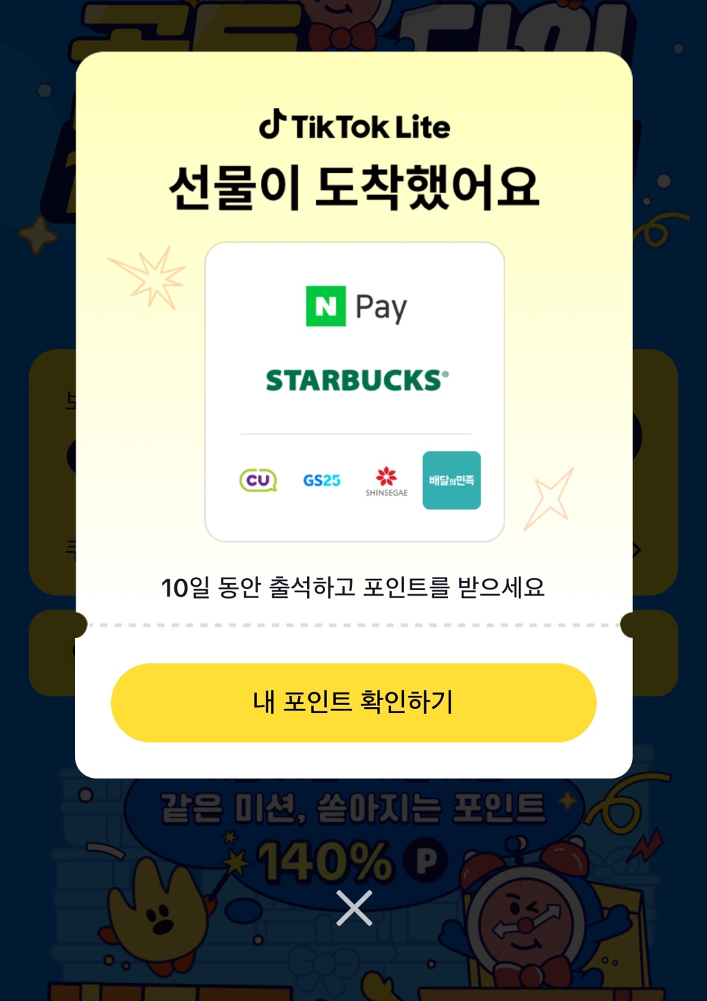 그렇게 받은 포인트는 어플에서 스타벅스 커피 교환권 등으로 바꿀 수도 있고 현금처럼 인출하여 사용할 수도 있다고 합니다. 우연히 보게된 어떤 블로거 분은 틱톡라이트 출첵 미션으로 두 달 동안 천 만원 넘게 버셨다고 하니 믿기지 않으면서도 추천인 코드로 가입이 계속 이어지면 불가능한 일도 아니겠다는 생각이 듭니다.
