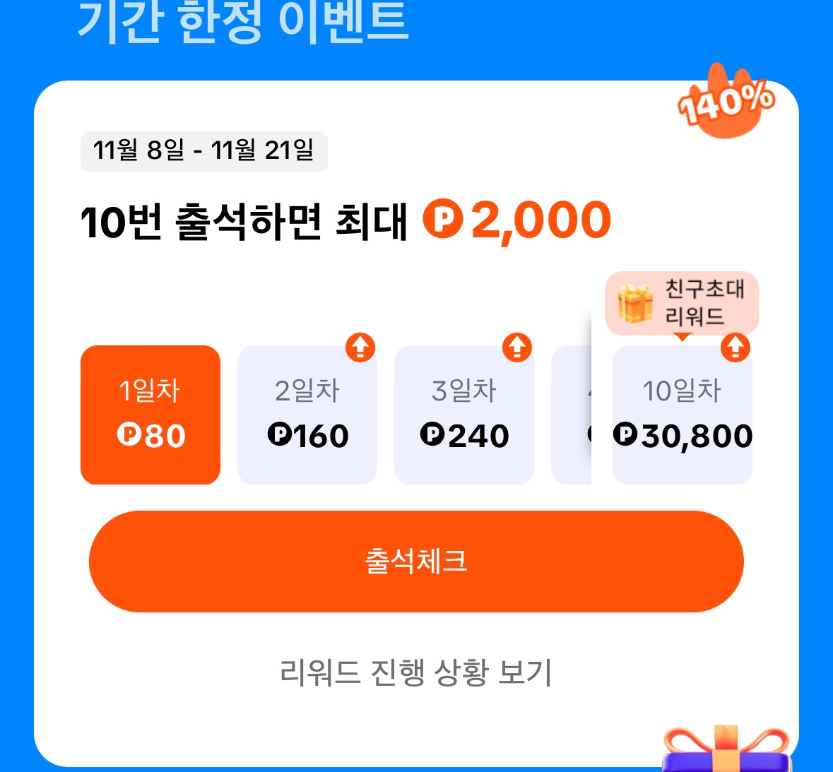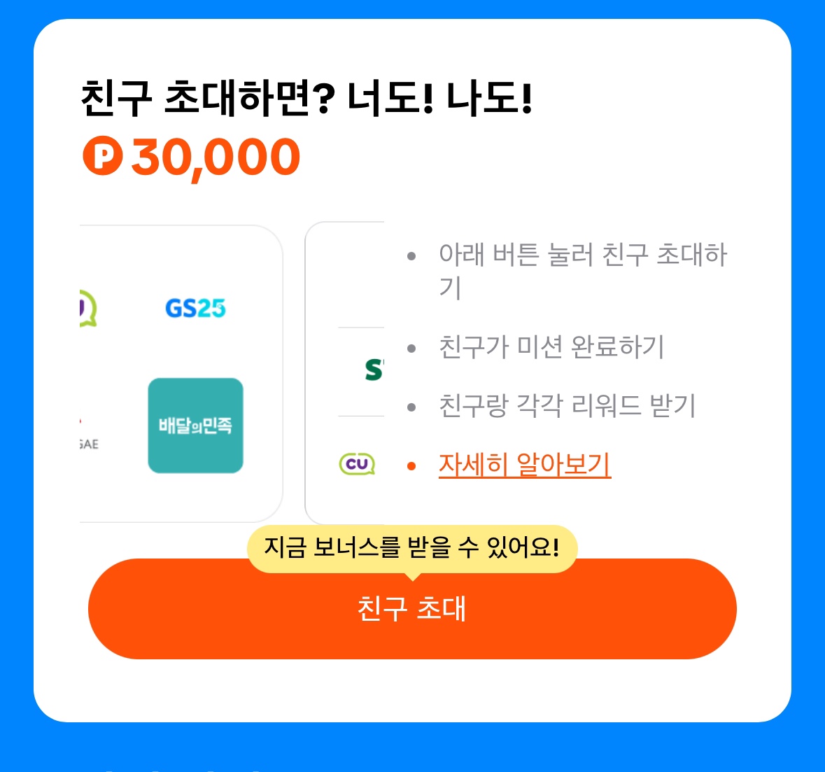 위 경로로 가입하신 후 10일간 출첵 빠짐없이 완료하면 가입하신 분도 30,000원(최대 50,000) 추천인도 같은 금액을 10일 뒤에 포인트로 받을 수 있습니다. 그러니 이제 시작하시려는 분은 위의 추천인 코드 활용하신 후 본인 추천인 코드 생성 후 다른 분들에게 권하고 그 분들이 그 경로로 설치하면 더 큰 포인트를 받을 수 있는 구조입니다.