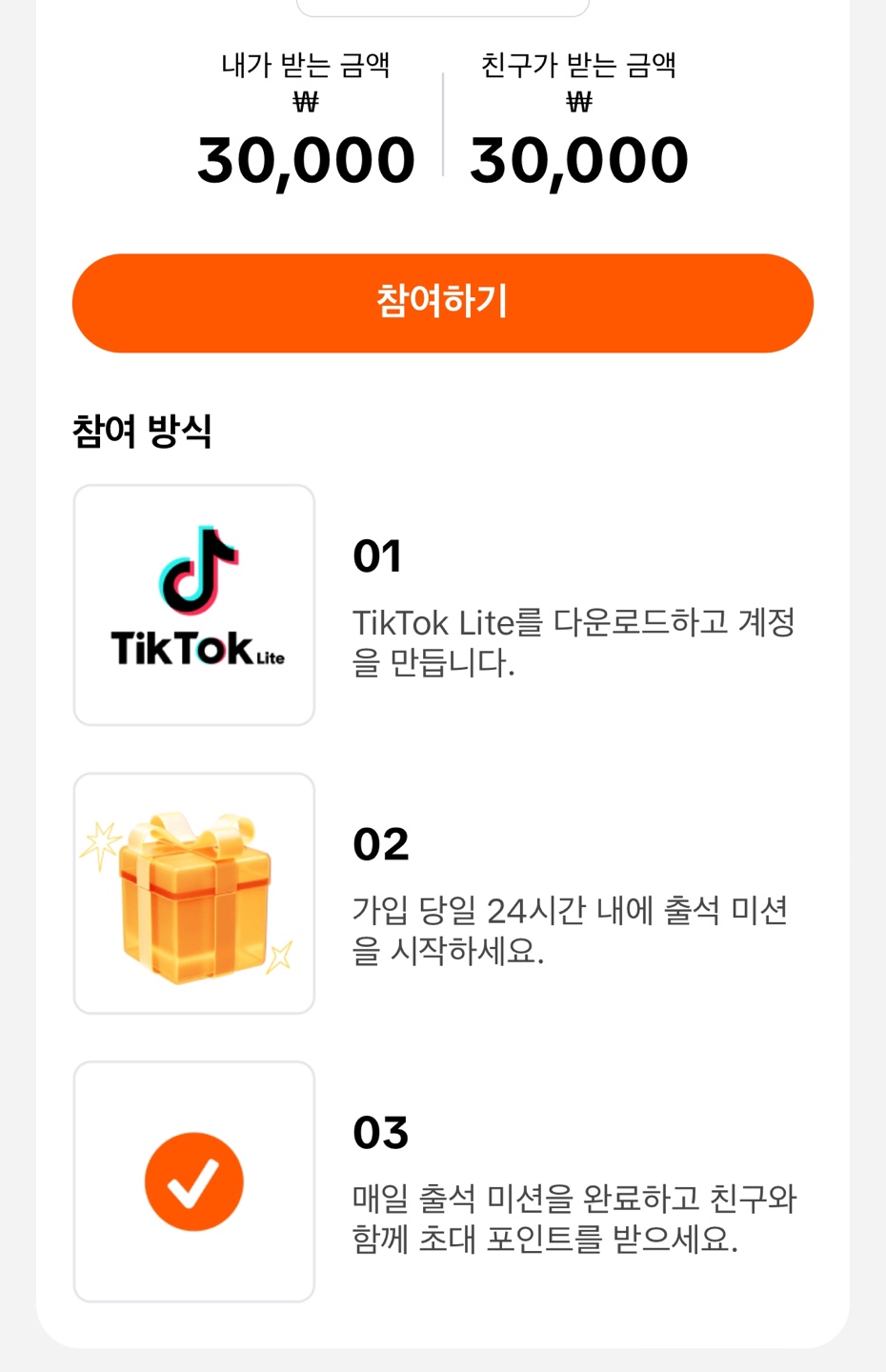 어플 '틱톡 라이트'로 앱테크 하시려면 당연히 어플 설치하셔야겠지요? 그런데 무작정 틱톡 라이트 설치 후 가입하시면 출첵 보상 못 받습니다. 틱톡 라이트 설치 후 가입하실 때에는 반드시 추천인 코드를 따라 가입하셔야 혜택 받을 수 있습니다. (추천인 코드 공유)