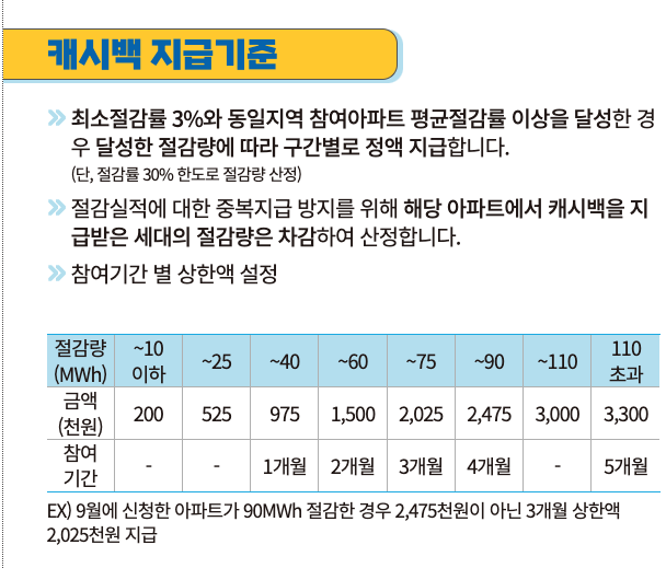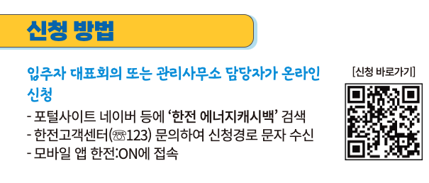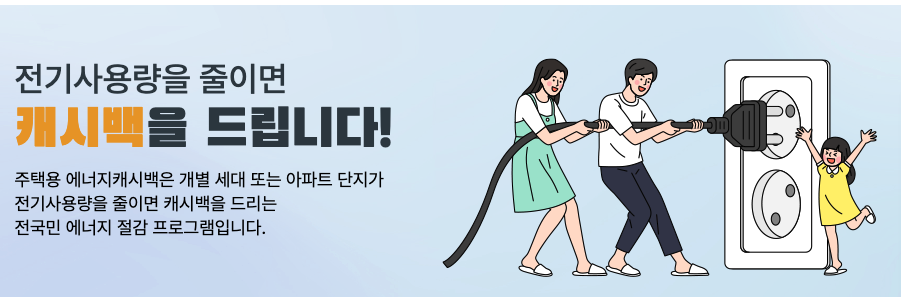 주택용 에너지 캐시백은 일정 기준 전기 사용량을 줄이면 캐시백을 주는 전국민 에너지 절감 프로그램입니다. 주택용(가정용) 전기를 사용하는 개별세대(일반 주택, 아파트 등)에 거주하시는 분들은 직접 신청하실 수 있고, 관리비에 전기 요금이 포함된 아파트 단지의 경우, 공동 관리 주체(입주자 대표, 관리 사무소 담장자)에서 신청하실 수 있습니다.
