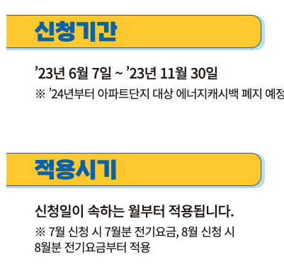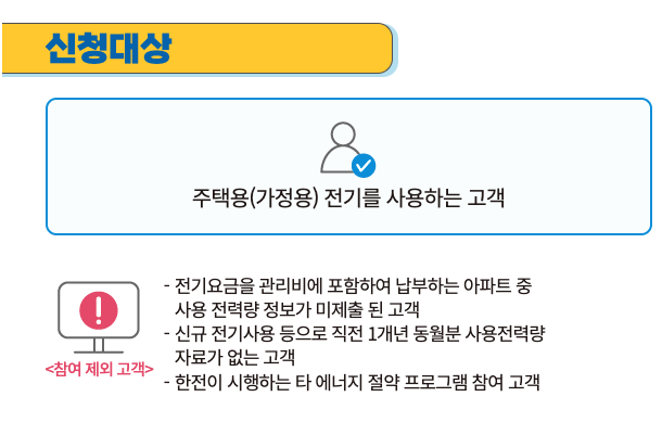 개별 세대(주택, 아파트 거주)의 경우 주택용 전기를 사용하는 고객이 신청 대상입니다. 단 전기 요금을 관리비에 포함하여 납부하는 아파트 거주하는데 사용 전력량 정보가 제출되지 않은 고객이나 지난 1년 사용 전력량 자료가 없는 고객, 한전의 다른 에너지 절약 프로그램 참여 고객은 신청할 수 없습니다. 또 공동주책 관리 주체가 신청하는 캐시백의 경우 23년 11월 30일까지 신청 받으며 24년부터는 아파트단지 대상으로 하는 에너지 캐시백는 폐지된다고 합니다.