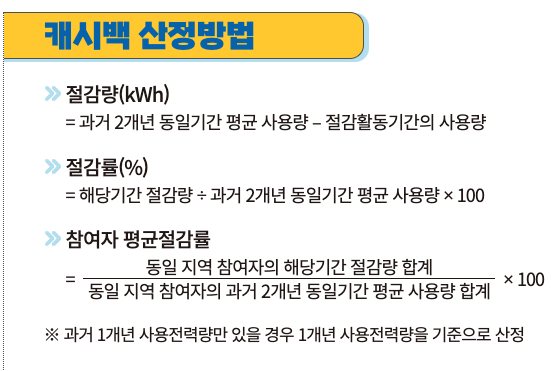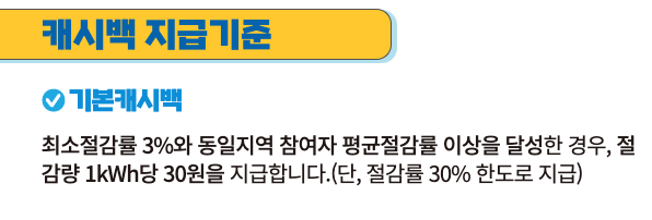 우선 기본 캐시백은 최소 절감률 3%와 같은 지역 참여자 평균 절감률 이상을 달성한 경우, 절감량 1kwh 당 30원을 지급합니다.(단, 절감률은 30% 한도까지 지급하고 그 이상은 지급하지 않습니다.)