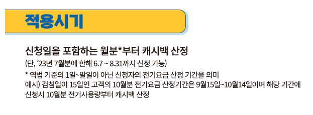 이때 월분이란 신청자의 전기 요금 산정 기간을 의미하는 것으로 예를 들어 전기 검침일이 15일인 경우 9월 전기 요금 산정 기간은 8월 15일 ~ 9월 14일이고 만약 이 기간에 에너지 캐시백 신청했다며 9월분 전기 사용량부터 캐시백 산정 대상이 됩니다.