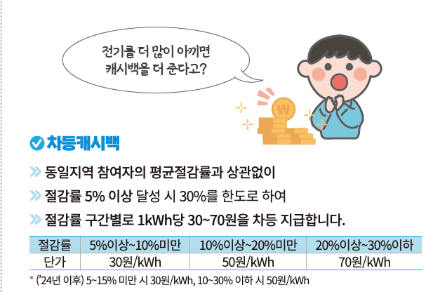 다음으로 차등 캐시백이 있습니다. 동일 지역 참여자의 절감률과 상관없이 절감률 5% 이상 달성하면 절감률 1KWh당 30~ 70원을 차등지급하는 것으로 됩니다.