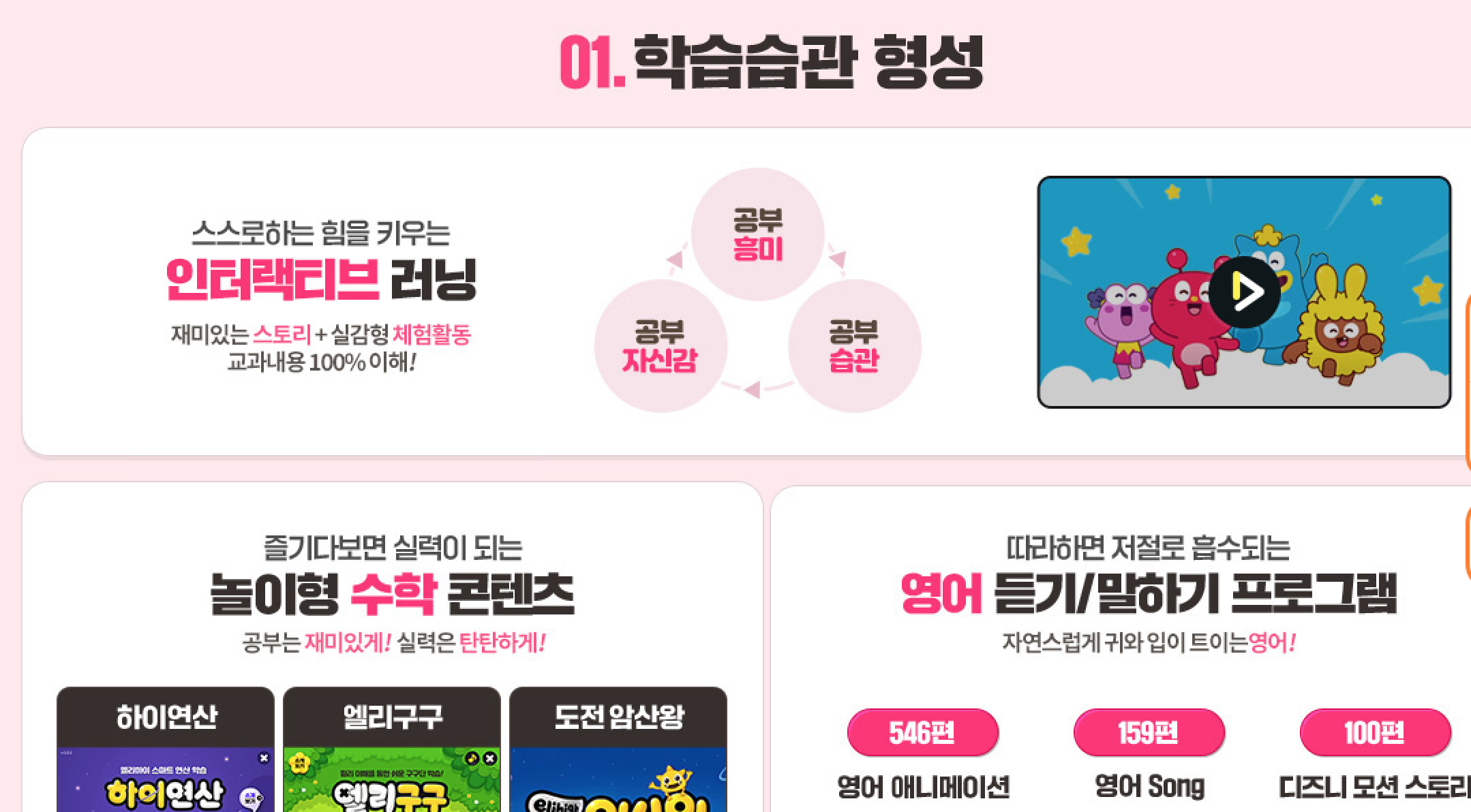 우선 학습동기 및 습관을 만들어주는 일일학습 시스템으로 아이들이 매일 꾸준히 공부할 수 있게 유도하고 학습 동기 유발을 위한 소소한 학습 보상도 같이 이뤄지고 있습니다.