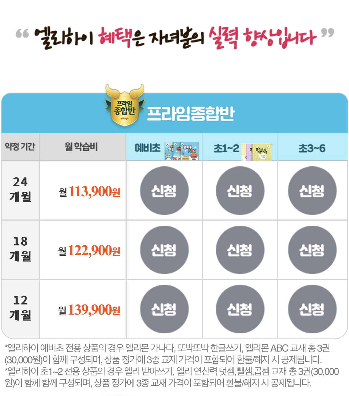 엘리하이는 예비초등학생부터 초2, 초3~4, 초5~6으로 나누어 수업이 구성되어 있습니다.