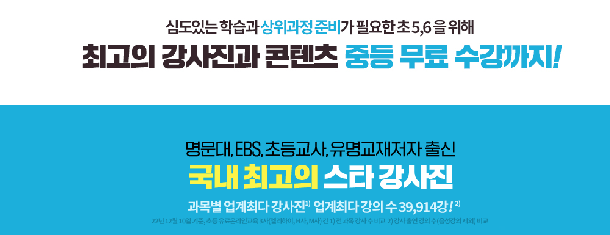 또 심도 있는 학습과 상위 과정 준비가 필요한 초5,6을 위해서는 최고 강사진의 수업이 다양하게 준비되어 있습니다