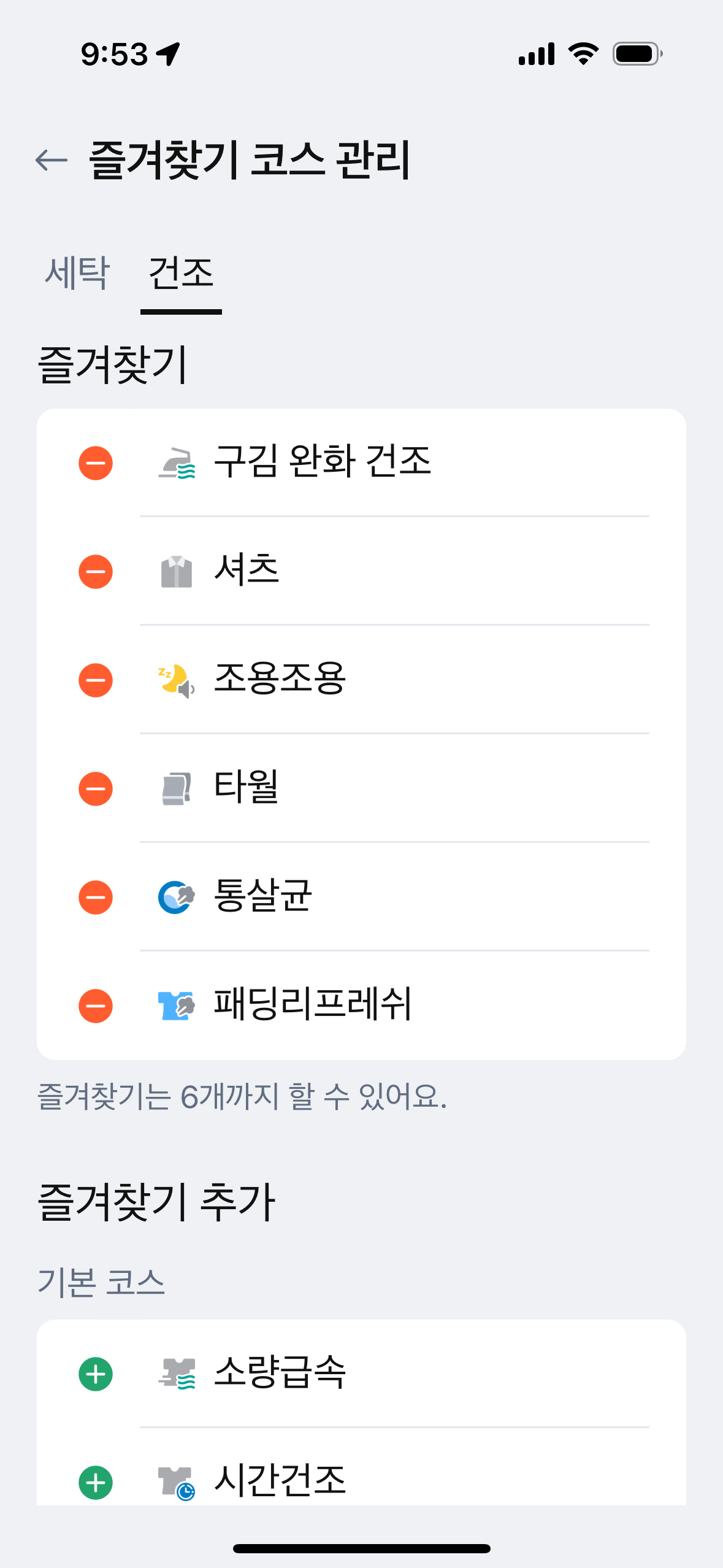 그러면 즐겨찾기 항목에 패딩리프레쉬 기능을 추가해줍니다. 즐겨찾기는 최대 여섯 개까지 추가할 수 있기 때문에 필요에 따라 추가하거나 제거하시면 됩니다. 이렇게 즐겨찾기에 패딩리프레쉬를 추가하셨다면 다시 워시타워(혹은 건조기) 화면으로 돌아가서 패딩리프레쉬 코스를 선택합니다.
