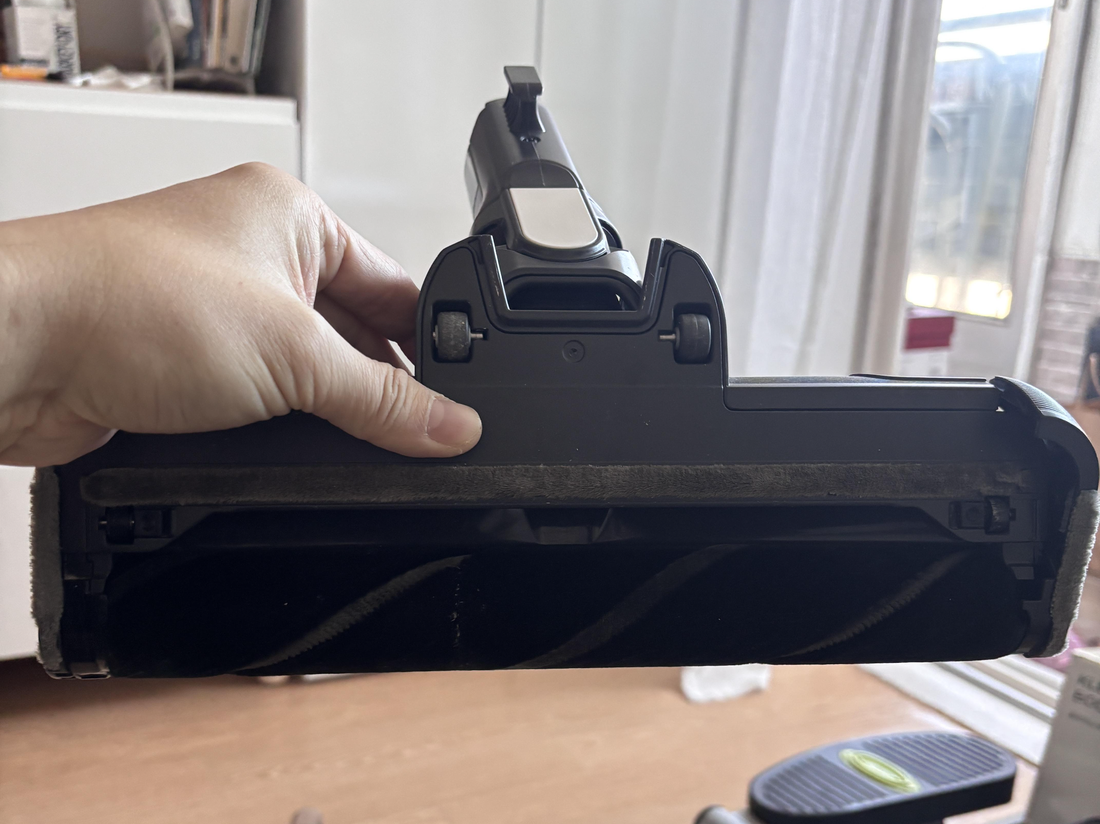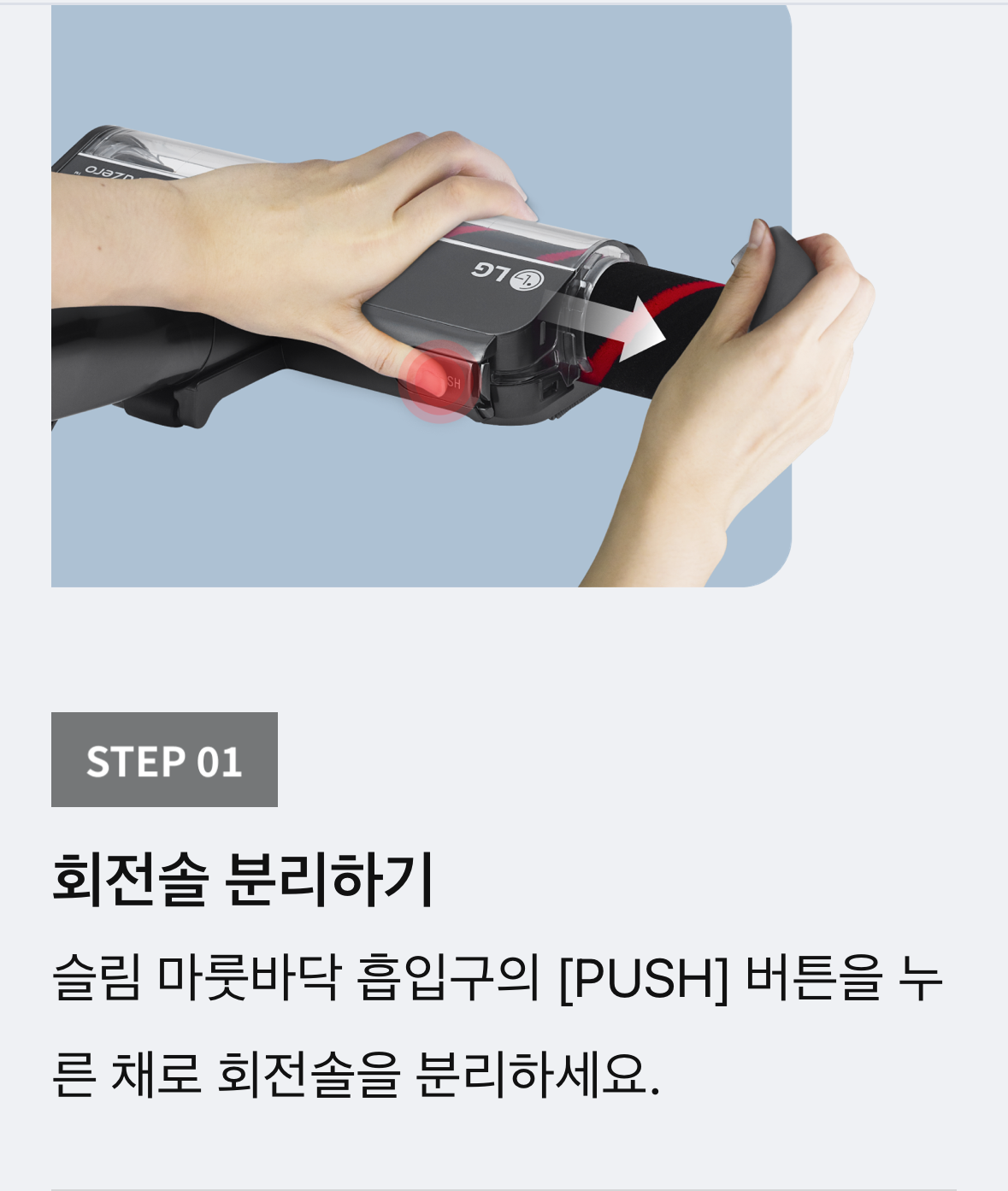 제일 먼저 청소기에서 맨 아래 바닥에 닿는 부분(흡입구)의 PUSH 버튼을 누른 상태로 청소기 회전솔을 분리합니다.
