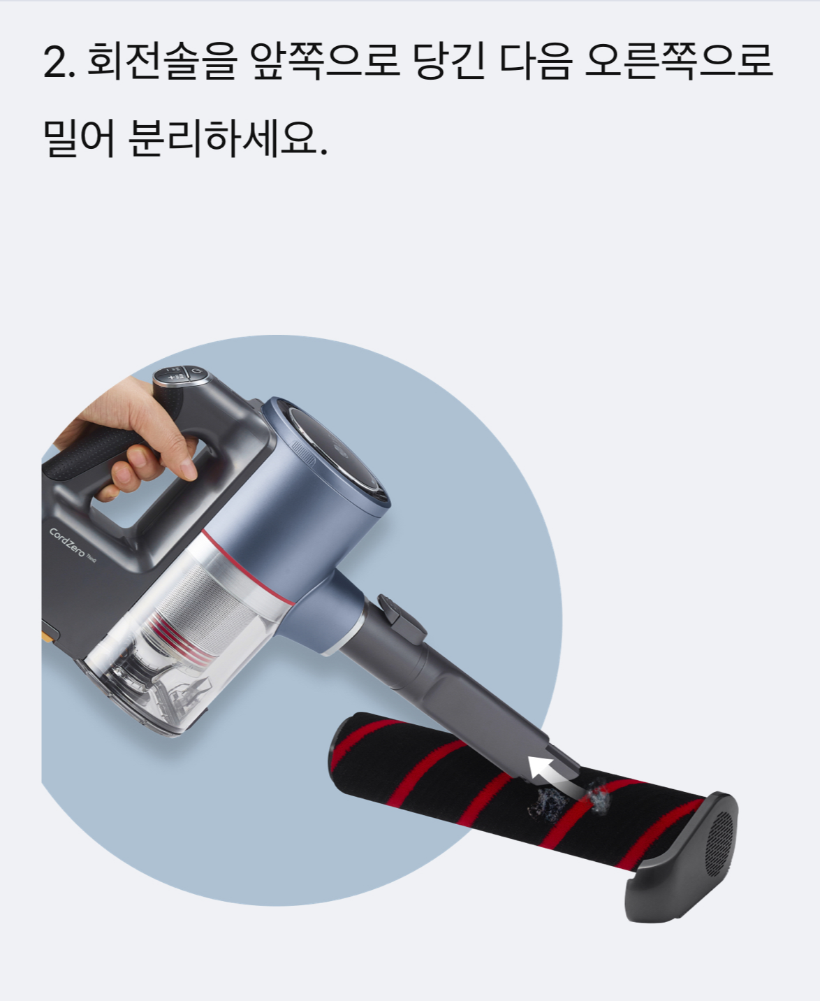 회전솔에 붙은 먼지는 청소기 헤드 쪽 흡입구를 통해 제거해줍니다. 그리도 남은 이물질의 경우 물기가 적은 타월이나 천으로 제거합니다. 회전솔이나 흡입구는 절대 물에 담그거나 세척하면 안 됩니다.