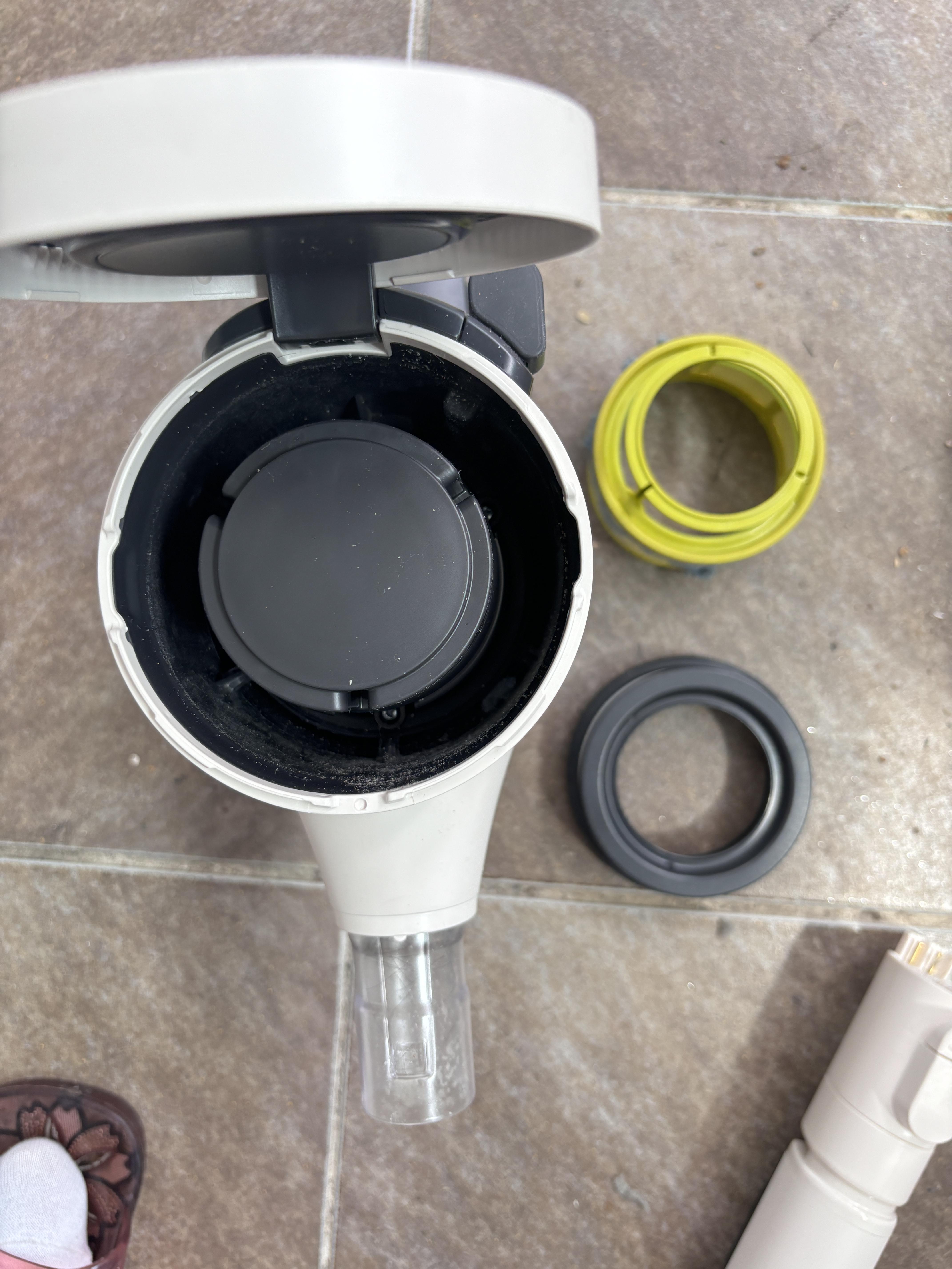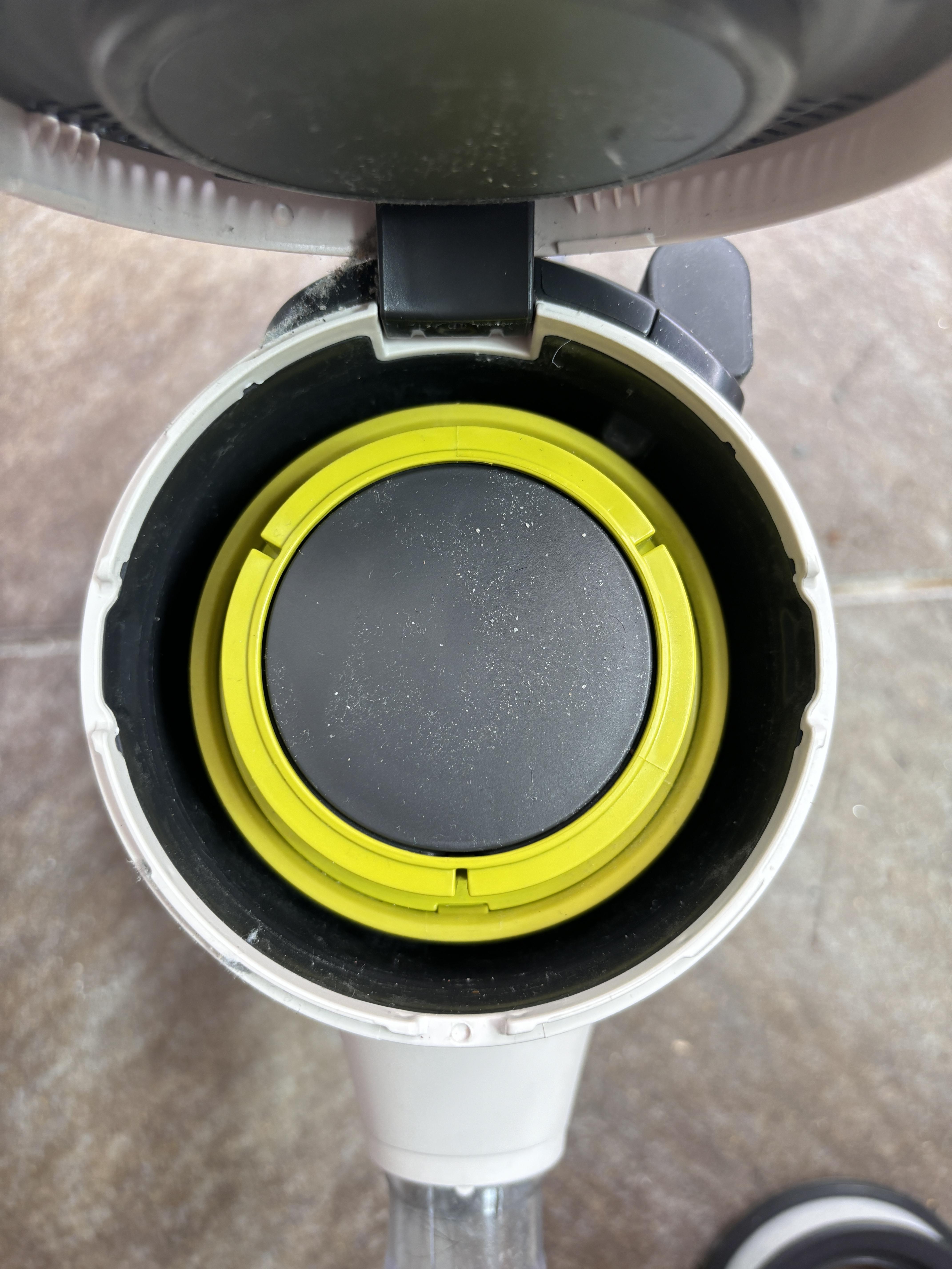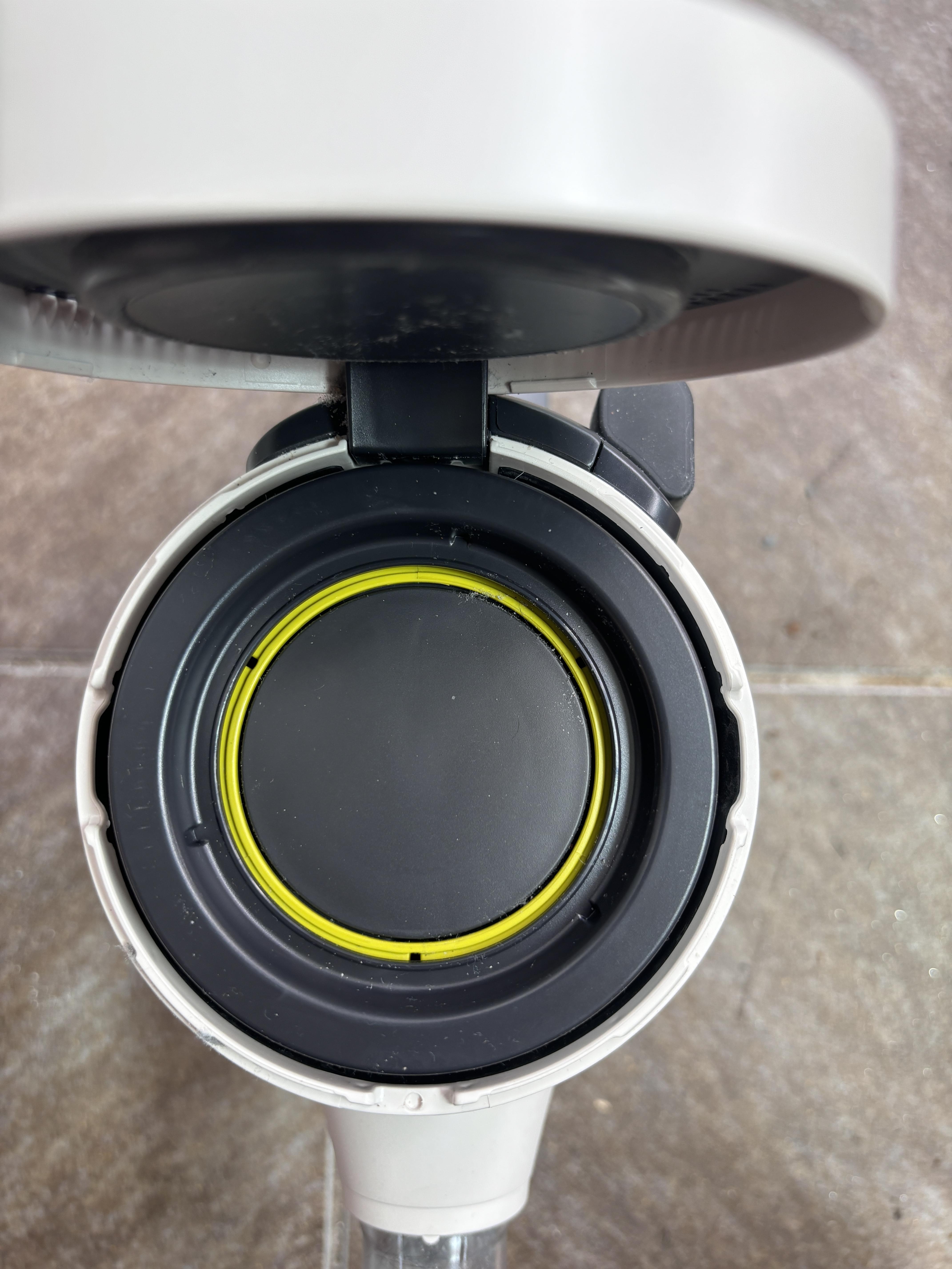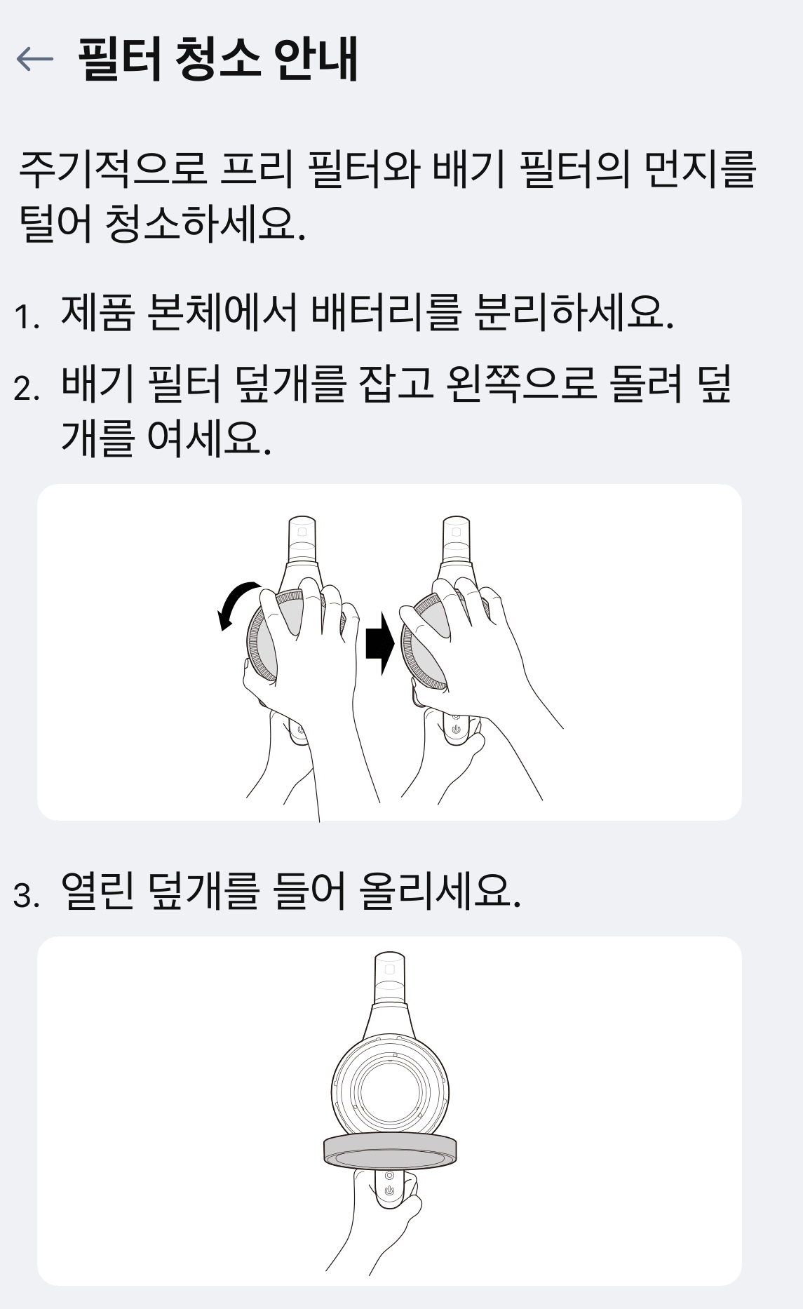 필터 청소를 마무리했으면 분리한 역순으로 필터를 조립합니다. 겨자색(프리 필터) 먼저, 검은색(배기 필터) 순입니다. 잘 돌려서 딱 맞게 조립해주면 끝입니다. 맨 마지막 배기 필터 덮개를 오른쪽으로 돌려서 딱 맞게 잠급니다.