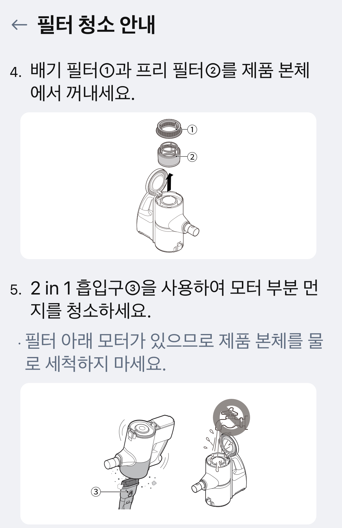 청소 후 배기 필터와 프리 필터를 잘 끼워 사용하셔야 합니다. 그렇지 않으면 제품 고장의 원인이 될 수도 있습니다.