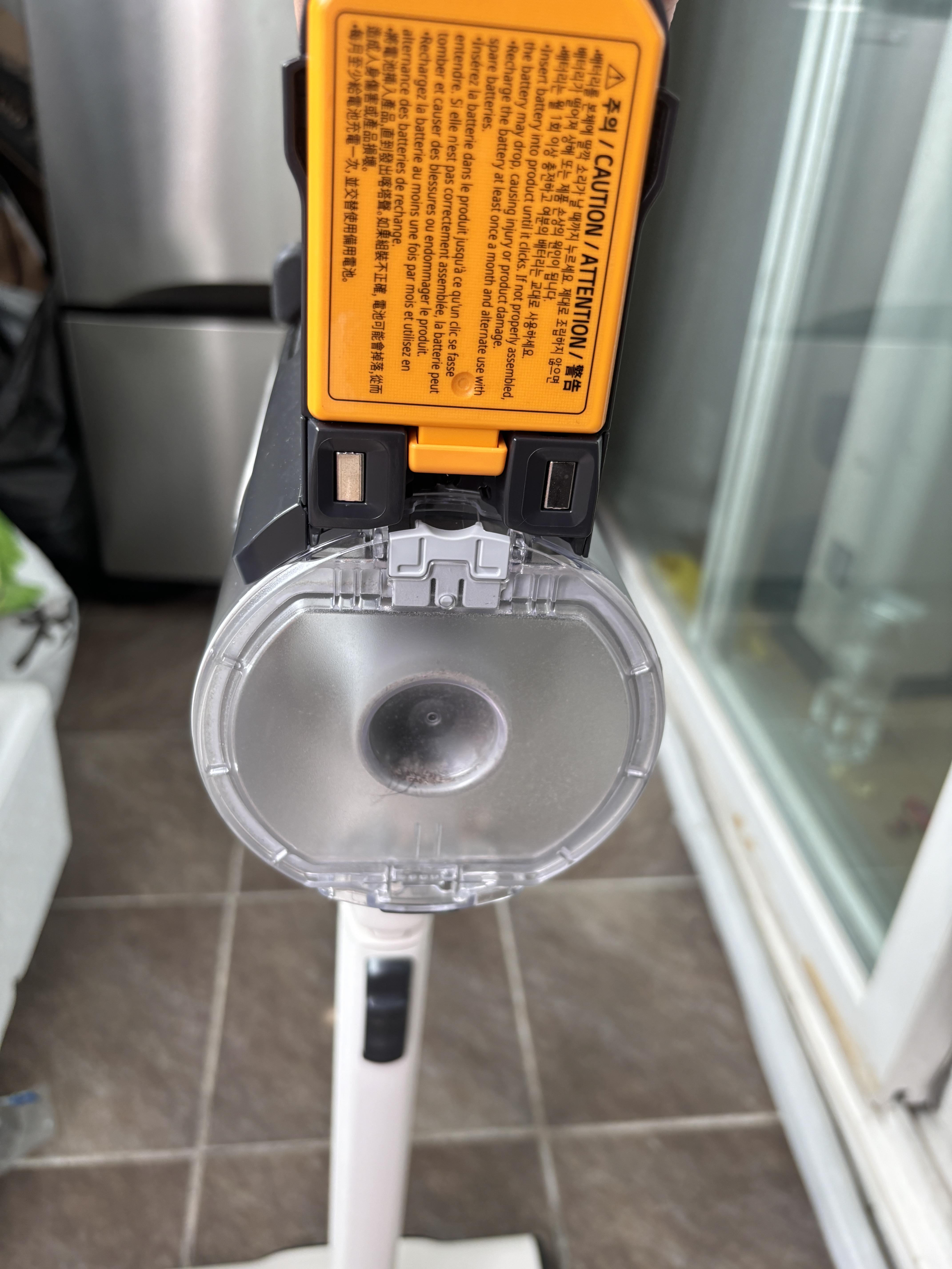 자 그럼 본격적으로 엘지 무선 청소기 필터 청소를 해보겠습니다. 기계를 다루는 것이 늘 조심스러운 저는 엘지 ThingQ 어플에서 알려주는 대로 청소를 했습니다. 우선 제품 본체에서 배터리를 분리하라고 합니다. 그래서 본체에서 배터리를 분리했습니다.