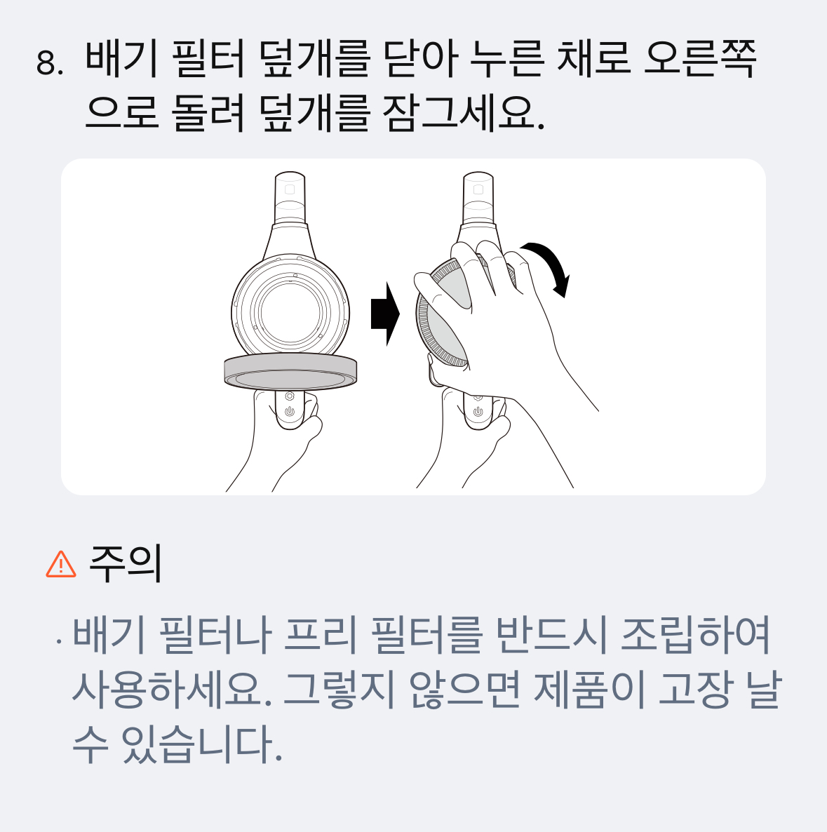 필터 청소를 마무리했으면 분리한 역순으로 필터를 조립합니다. 겨자색(프리 필터) 먼저, 검은색(배기 필터) 순입니다. 잘 돌려서 딱 맞게 조립해주면 끝입니다. 맨 마지막 배기 필터 덮개를 오른쪽으로 돌려서 딱 맞게 잠급니다.