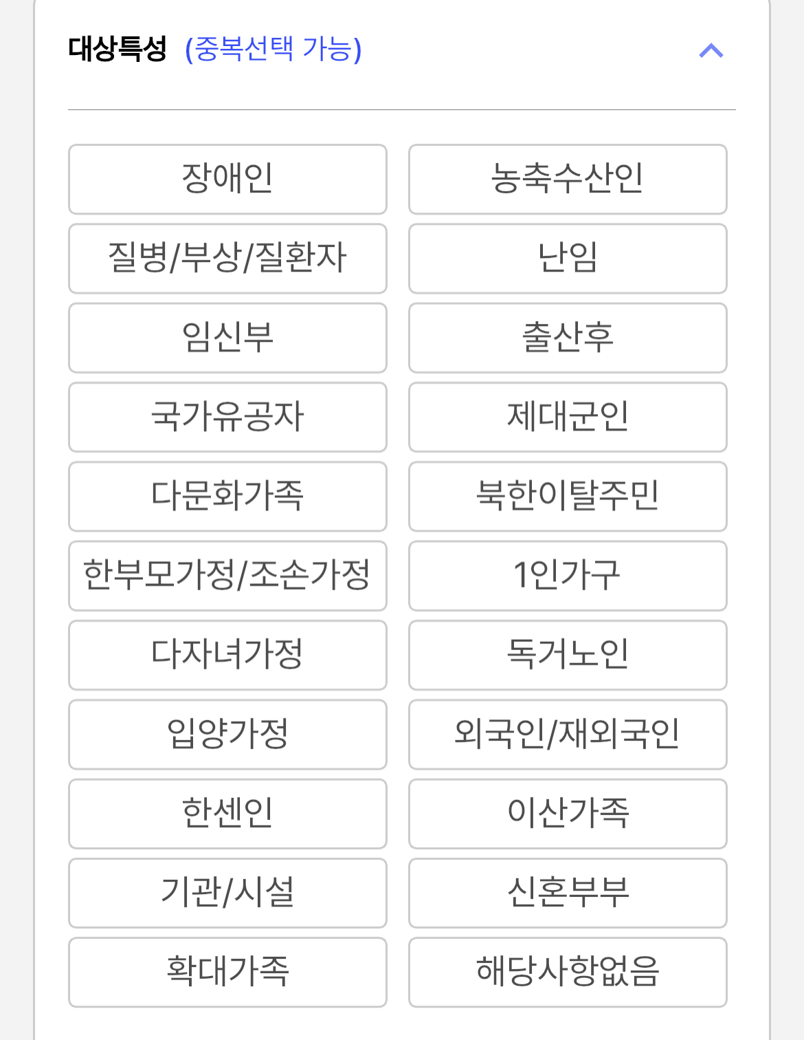10번째, 대상 특성이라는 항목에 해당 사항이 있으면 체크하시고 없으면 해당사항없음을 체크하시면 됩니다.