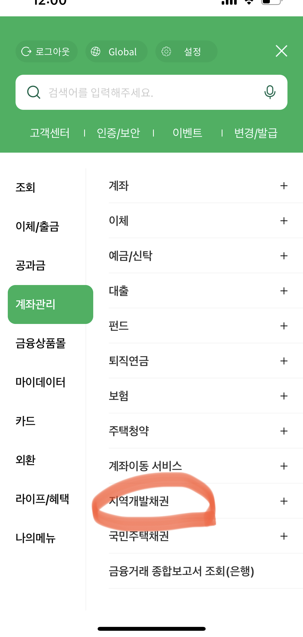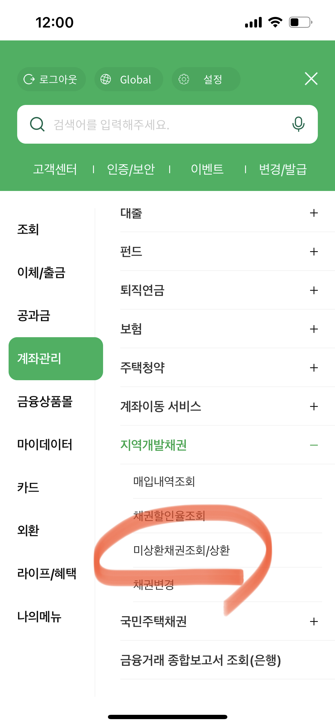 각 은행 어플이나 홈페이지에 접속하셔서 로그인 하신 후 계좌조회 등에서 '미상환 채권' 이라는 항목을 찾아 조회 및 신청 진행하시면 됩니다. 가장 많은 지역이 이용하는 농협은행으로 예를 들면 어플로 로그인 후 계좌관리 항목을 눌러주면 그 아래 지역개발채권 항목을 확인하실 수 있습니다.